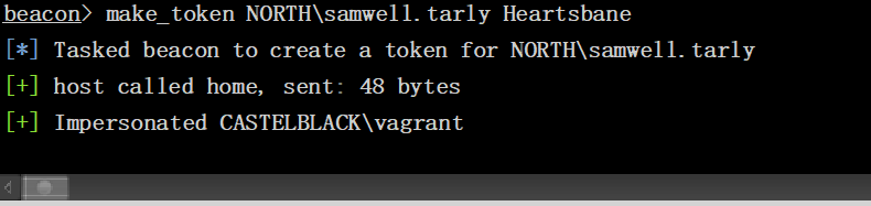 beacon> shell net use \\WINTERFELL.NORTH.SEVENKINGDOMS.LOCAL\C$ /user:NORTH\samwell.tarly Heartsbane