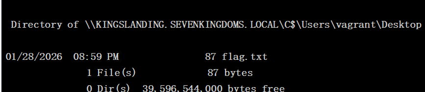 beacon> shell dir \\KINGSLANDING.SEVENKINGDOMS.LOCAL\C$\Users\vagrant\Desktop\flag.txt