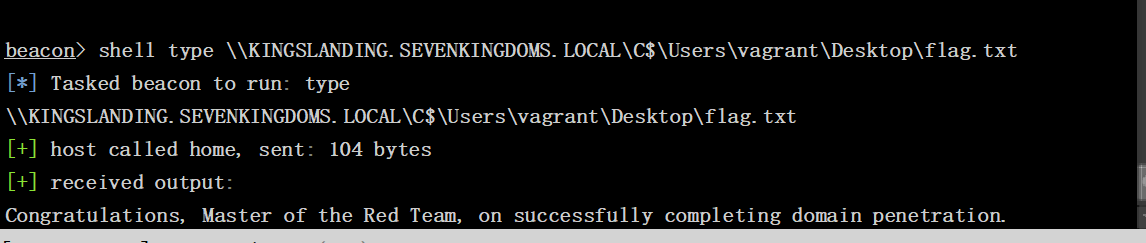 beacon> shell type \\KINGSLANDING.SEVENKINGDOMS.LOCAL\C$\Users\vagrant\Desktop\flag.txt